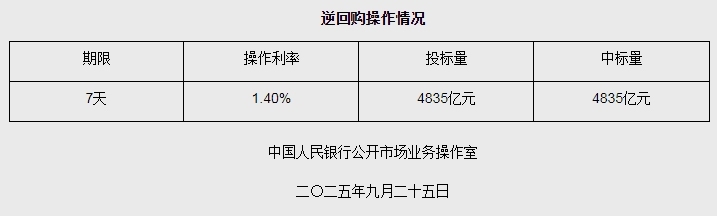 中国经济网络保留的所有权利 中国经济网络新媒体矩阵 在线音频 - 视觉节目许可证(0107190)(北京ICP040090) 公开市场业务交易公告[2025]第188号,2025年9月25日,中国人民银行进行了为期7天的反向重新购买4835亿元人民币的运营,并具有固定的利率和投标量。具体情况如下: (收费编辑:Shan Xiaobing)
